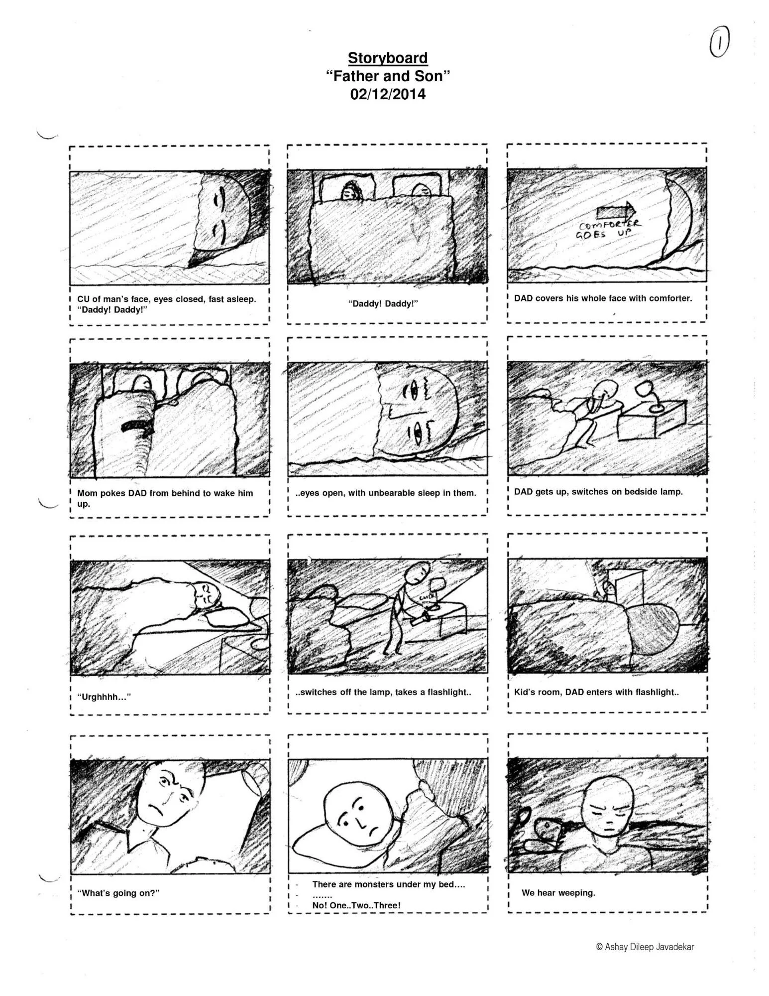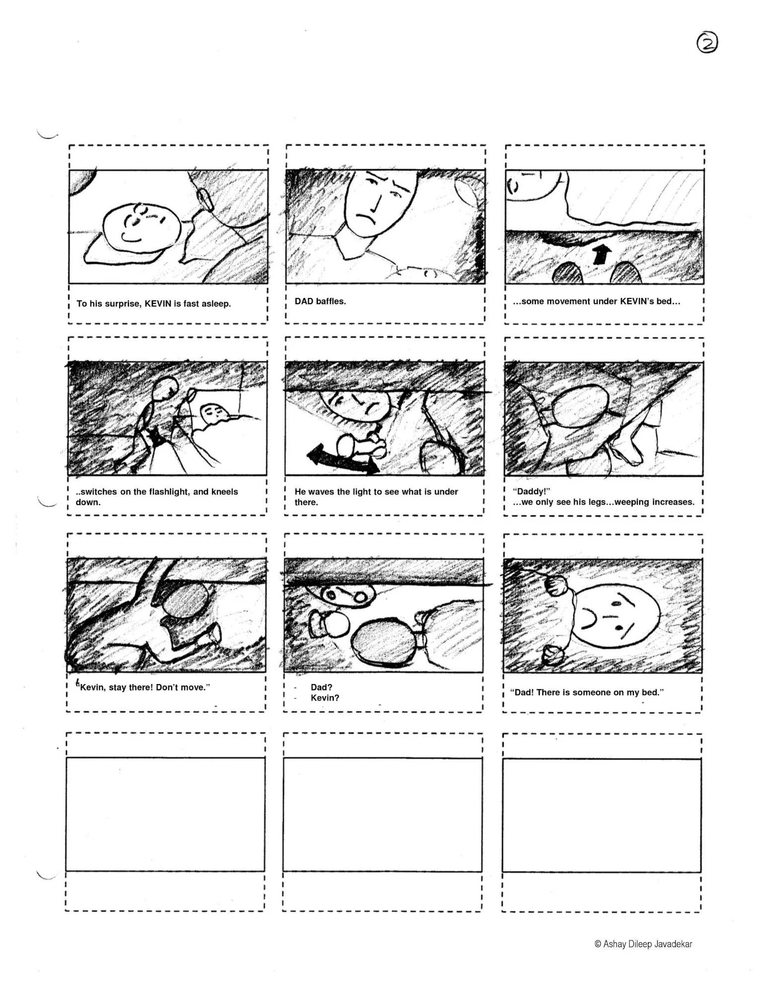 माझ्या “kevin” नावाच्या ४ मिनिटाच्या भयपटामध्ये २ प्रसंग होते, आणि २१ शॉट्स होते. त्याचा स्टोरीबोर्ड मी खालीलप्रमाणे काढला होता.